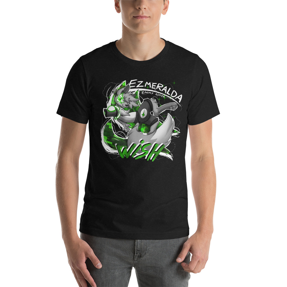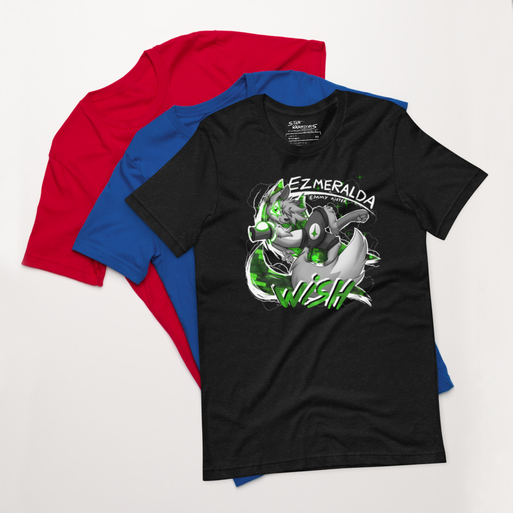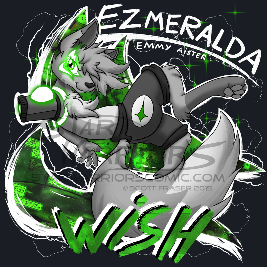 Ezmeralda is striking a dynamic pose, ready to grant your wish of being an amazing t-shirt! This black & white design features the main character of Star Warriors, accented by her classic emerald green color.